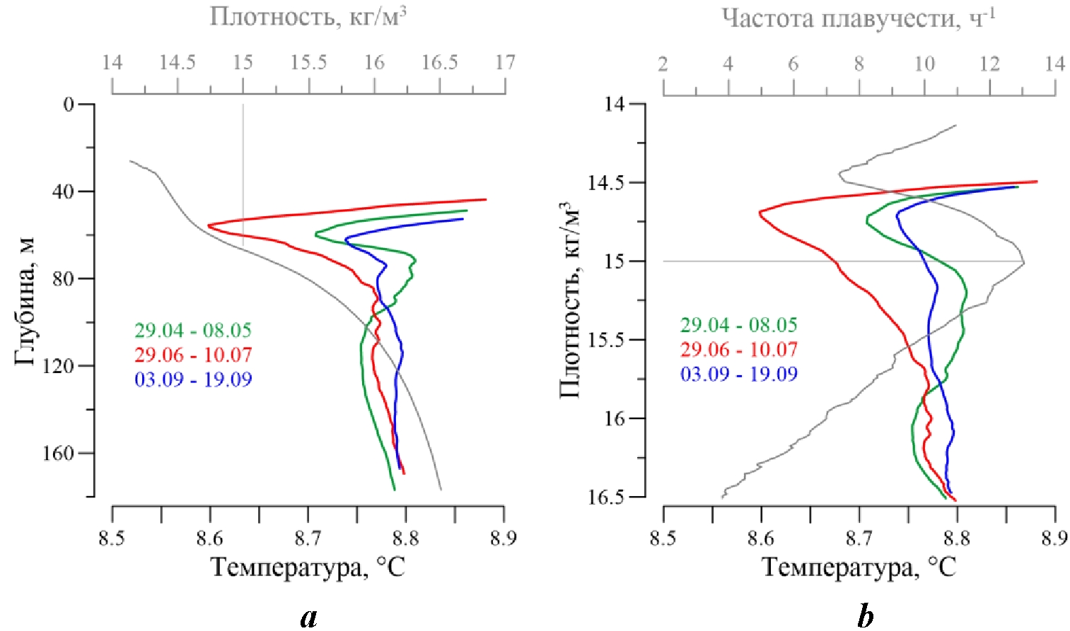 На рис. 3 для трех экспедиций показана осредненная по изопикнам вертикальная структура температуры воды на фоне среднего профиля плотности и частоты плавучести. Ниже верхнего однородного поверхностного слоя наблюдается локальный минимум частоты плавучести при значении потенциальной плотности ~ 14.5 кг/м3, максимум – в окрестности 15.0 кг/м3. Минимальные значения температуры наблюдаются при потенциальной плотности 14.7–14.8 кг/м3: 8.68 °С – в мае, 8.65 °С – в июле, 8.71 °С – в сентябре. Ранее нами было показано, что ХПС по данным контактных измерений в этом же районе моря имеет тенденцию к потеплению [5], и был предложен критерий границы ХПС в виде температуры 8.6 °С. Однако, по обсуждаемым данным экспедиций 2021 г., он не подходит. Можно рассматривать только границу 8.8 °С.