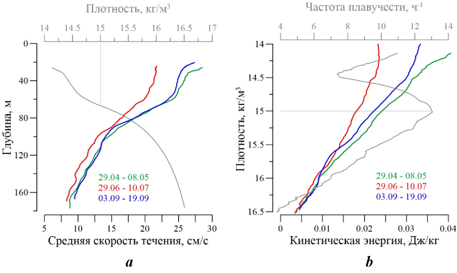 Среднеквадратический профиль модуля скорости течения во все сезоны показывает ее убывание с глубиной (рис. 4, а). При этом в диапазоне глубин 30–100 м значения модуля скорости течения весной и осенью выше, чем летом, когда крупномасштабная циркуляция моря ослабевает и сформирован сезонный термоклин. До значения плотности 14.5 кг/м3, соответствующего минимуму частоты плавучести, скорости течения изменяются слабо. В слое глубин 40–100 м (диапазон значений плотности 14.5 … 16.0 кг/м3) наблюдается резкое (почти двукратное) уменьшение модуля скорости течения, которое вызвано переходом части кинетической энергии в потенциальную энергию, определяемую отклонением изопикнических поверхностей от горизонтального положения.