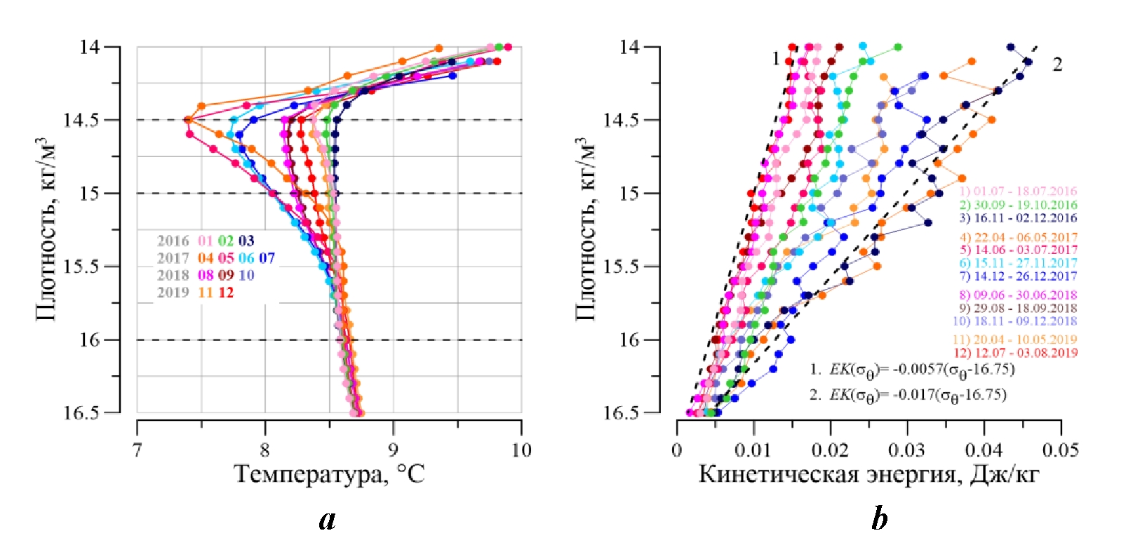 В вертикальных профилях кинетической энергии хорошо прослеживается ее уменьшение в верхнем слое в летний период и ее возрастание в весенний и особенно в зимний периоды. Профили могут быть аппроксимированы линейными зависимостями, которые пересекают нулевое значение при плотности 16.75 кг/м3. Аналогичные результаты получены по данным экспедиционных исследований 2016–2019 гг. Значения кинетической энергии в верхнем слое моря (при плотности 14 кг/м3) в летние периоды не превышают 0.02 Дж/кг по данным всех измерений 2016–2021 гг.