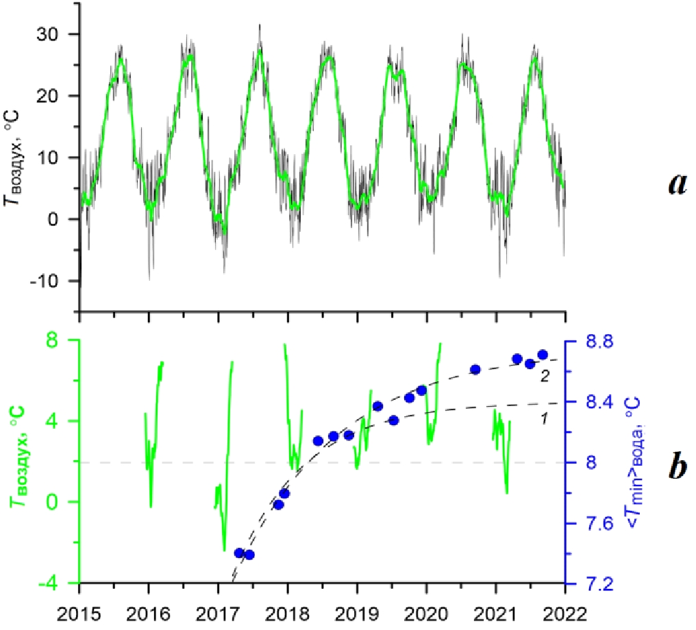 Рис. 6. Среднесуточная (серая линия) и среднемесячная (зеленая линия) температура воздуха в г. Керчи (a), средние значения минимальной температуры воды в профилях на станциях для экспедиций 2017–2021 гг. и среднемесячная температура воздуха в зимний период в Керчи (b). Линии 1 и 2 – аппроксимирующие функции