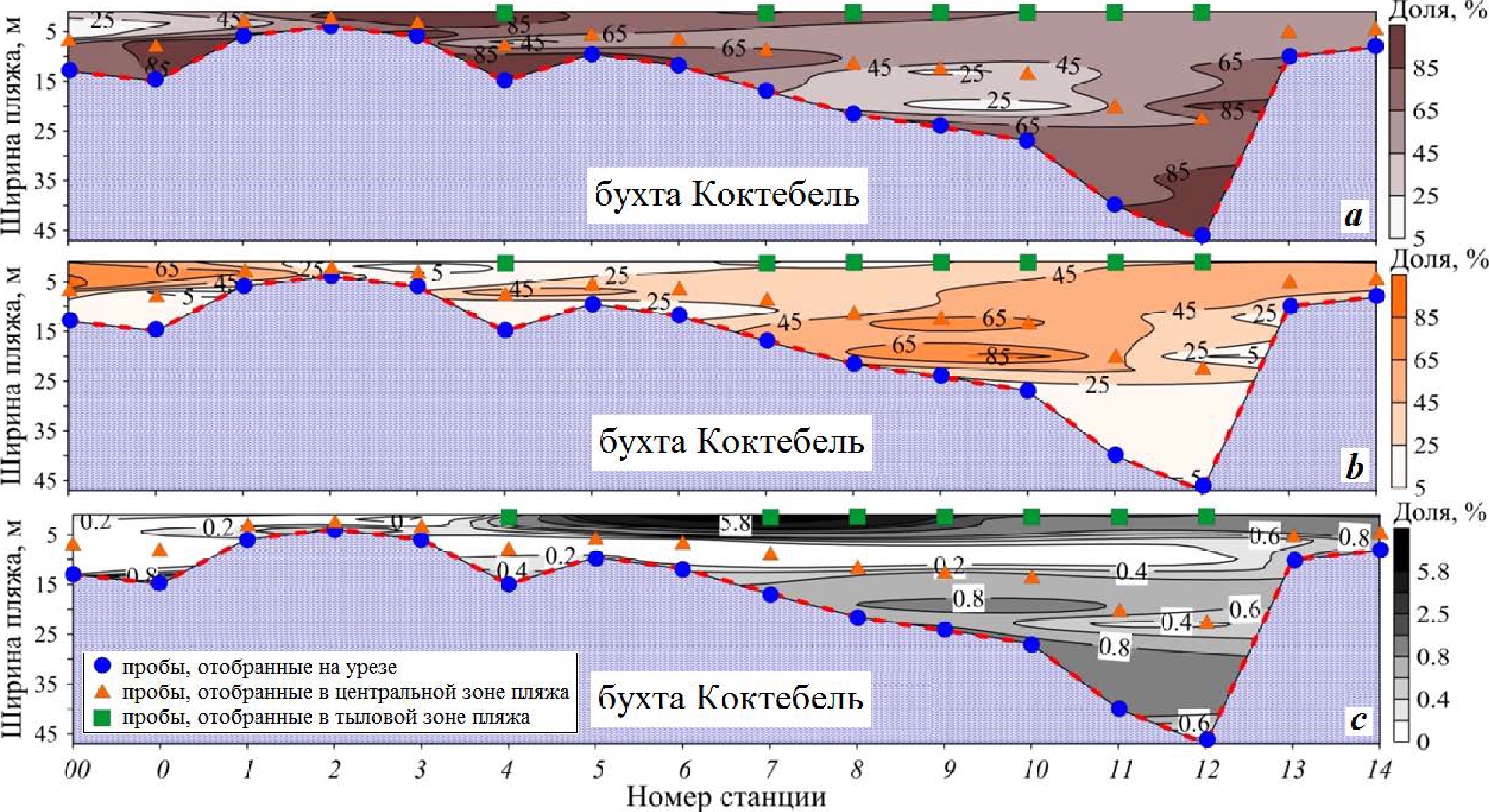 Since the width of the beaches of the Koktebel Bay coastal zone varies significantly, the granulometric composition of sediments in the central and rear sections of the beaches is quite diverse.