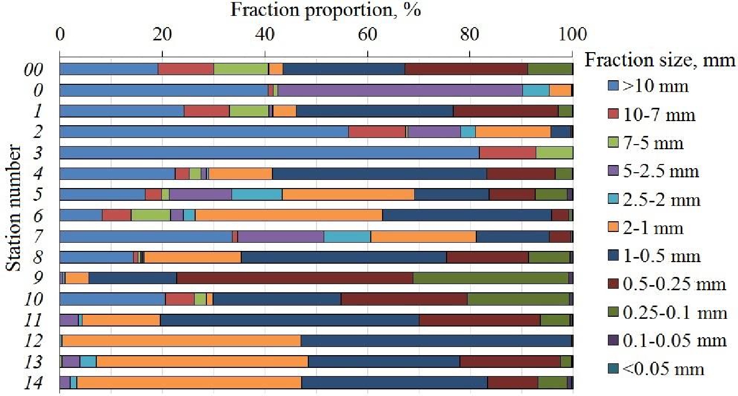 The third area (stations 11–14) is characterized by a gradual decrease in the width of the beaches from 43 to 5 m. As a result, the amount of sand material decreases, and the amount of gravel one increases. A slight increase in the proportion of silty material is explained by its moving from the cliffs composed of clay-sand sediments in the rear section of the beach.