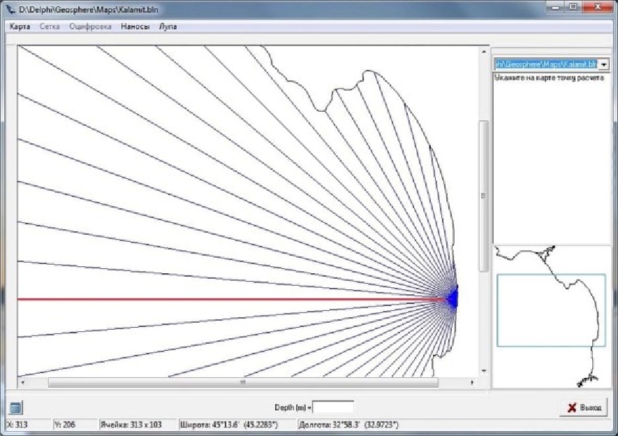 Работа с инструментом производится в два этапа. На первом из них необходимо загрузить контур береговой линии, при этом одноименная ЦМР загружается автоматически. Процесс загрузки сопровождается визуализацией береговой линии с возможностью масштабирования, в то время как карта глубин изначально скрыта, чтобы впоследствии не загромождать отображение лучей. В нижней информационной строке отображаются характеристики ячейки грида, соответствующей текущему положению курсора на карте, которые позволяют контролировать такие величины, как широта, долгота и глубина. Соответствующее меню дополнительно позволяет вывести полную версию массива глубин в виде самостоятельной таблицы с возможностью ее интерактивного редактирования.