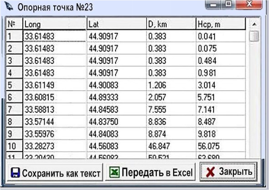 Рис. 3. Результирующая таблица представления профиля дна вдоль одного из лучей разгона в Каламитском заливе