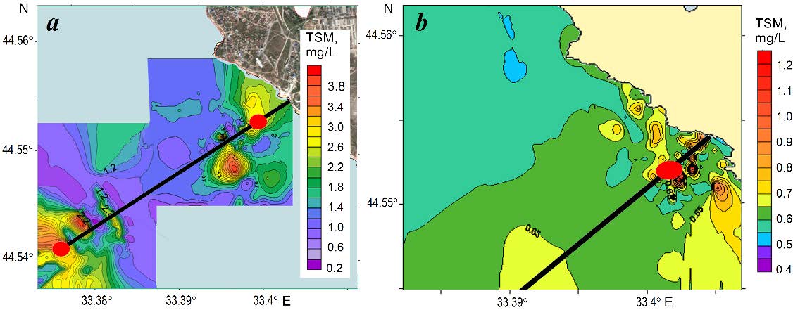Let us consider the structure of the TSM concentration field under conditions of different background stratification in the coastal areas of the Balaklava and Sevastopol wastewater sewers (Fig. 1).