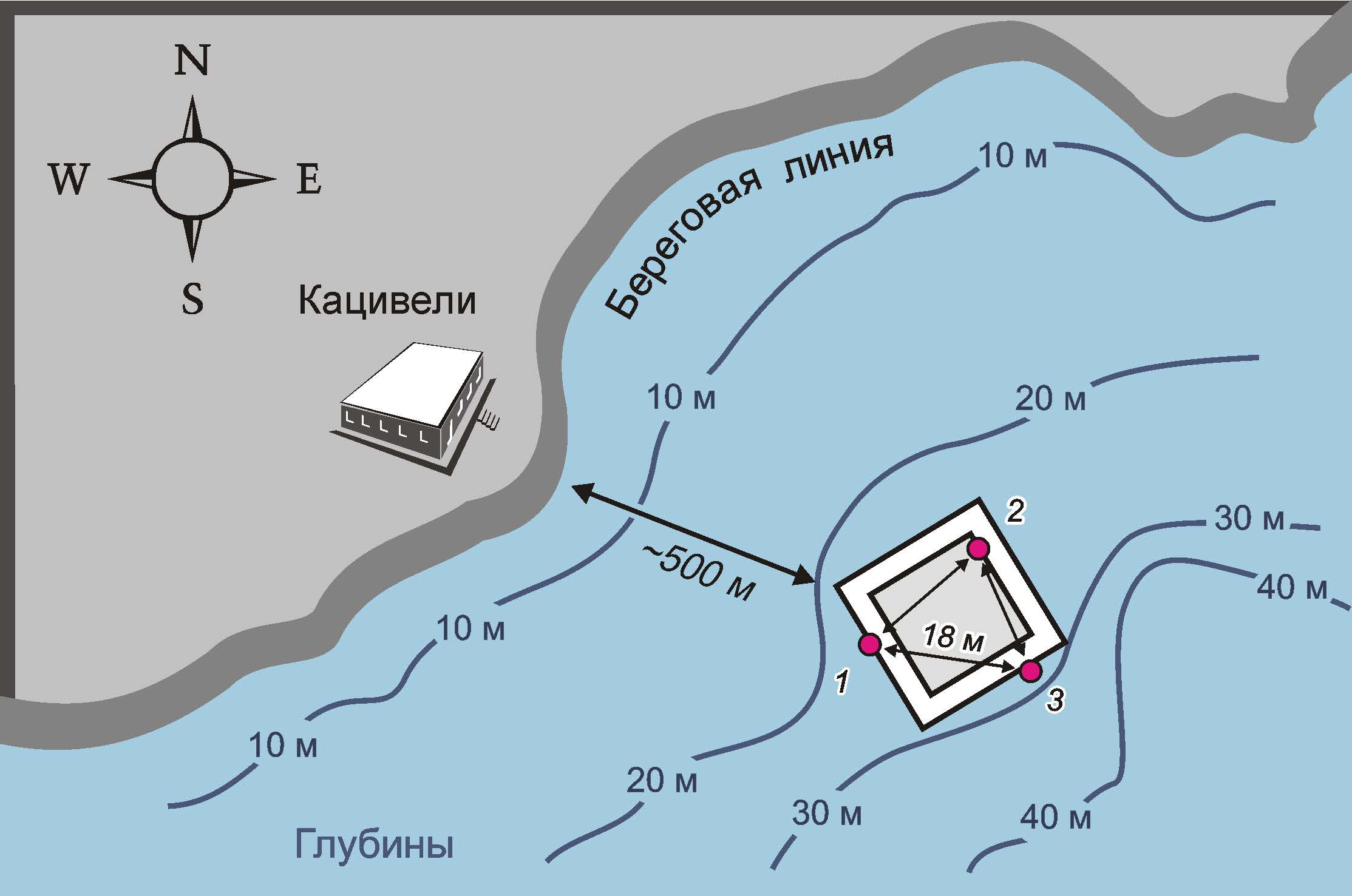 Fig. 1. Location and layout of a system of three thermoprofilemeters at the oceanographic platform. The red dots denote the installed thermoprofilemeters (1–3)