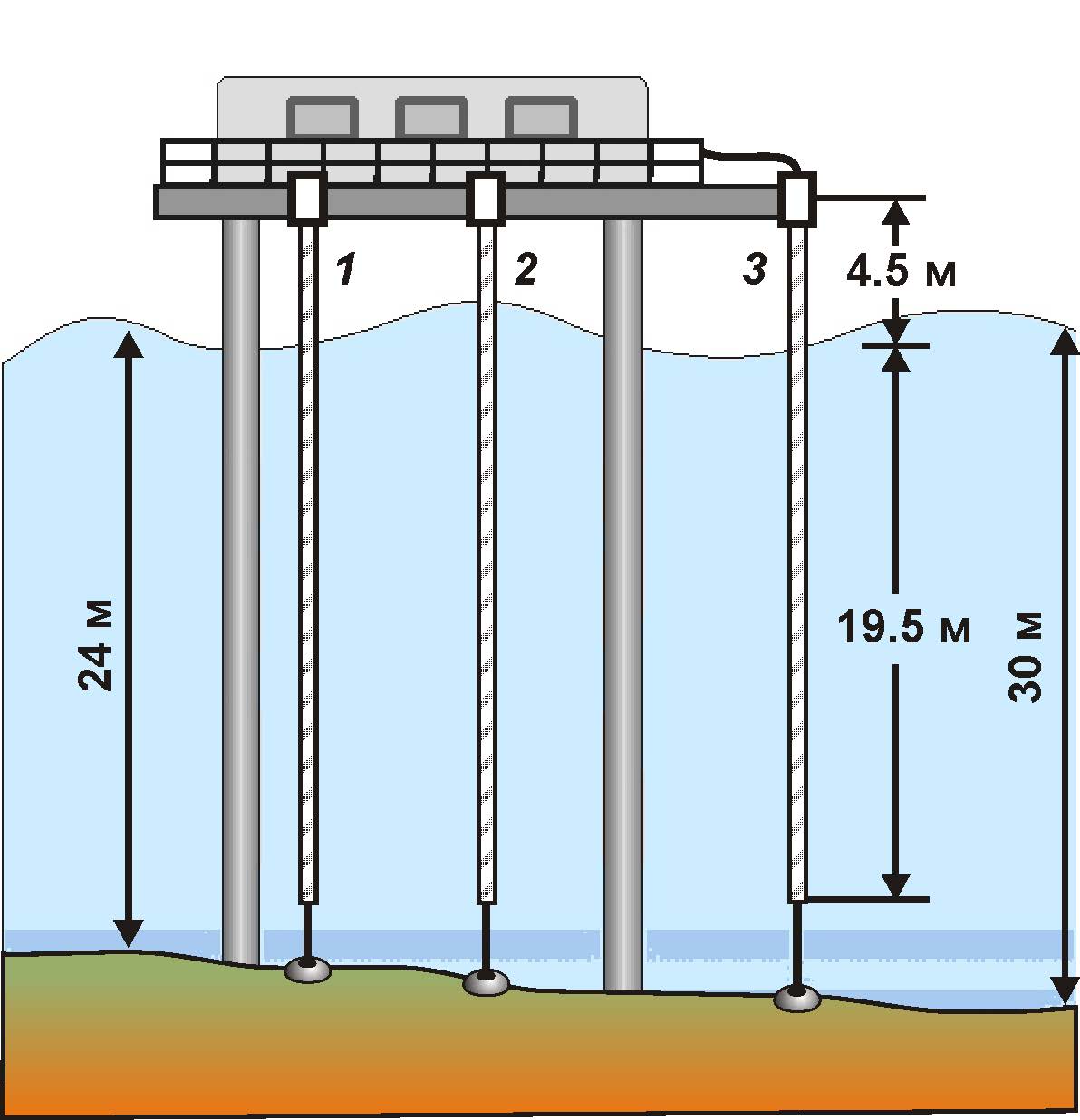 Рис. 1. Схема установки системы из трех термопрофилемеров у океанографической платформы. Красными кружками обозначены установленные датчики. Цифры 1–3 – номер профилемера