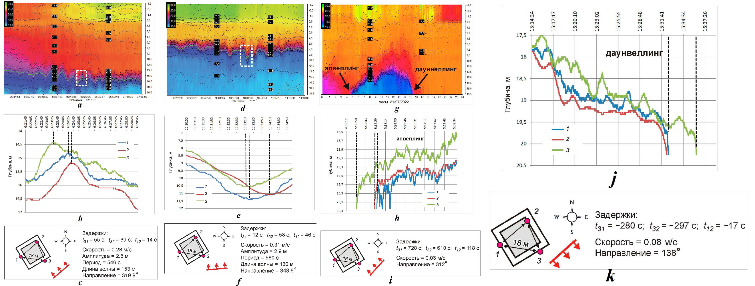 Рис. 4. Отображение на экране монитора результатов обработки данных системой: поле температуры с динамикой изотерм и градиентом профилей температур – a, d, g (белым прямоугольником (a, d) и стрелками (g) обозначена расчетная область); скоррелированные пространственные смещения выбранной изотермы в расчетной области на границе температурного фронта и внутренней волны для трех термопрофилемеров (1, 2, 3) – b, e, h, j (штриховые линии отмечают на графиках выбранные границы пространственного смещения изотермы во временном диапазоне для каждого датчика); результаты программного расчета динамических характеристик внутренних волн (c, f) по полученным временным задержкам (t31, t32, t12) и скорости и направления смещения фронтов при апвеллинге (i) и даунвеллинге (k)