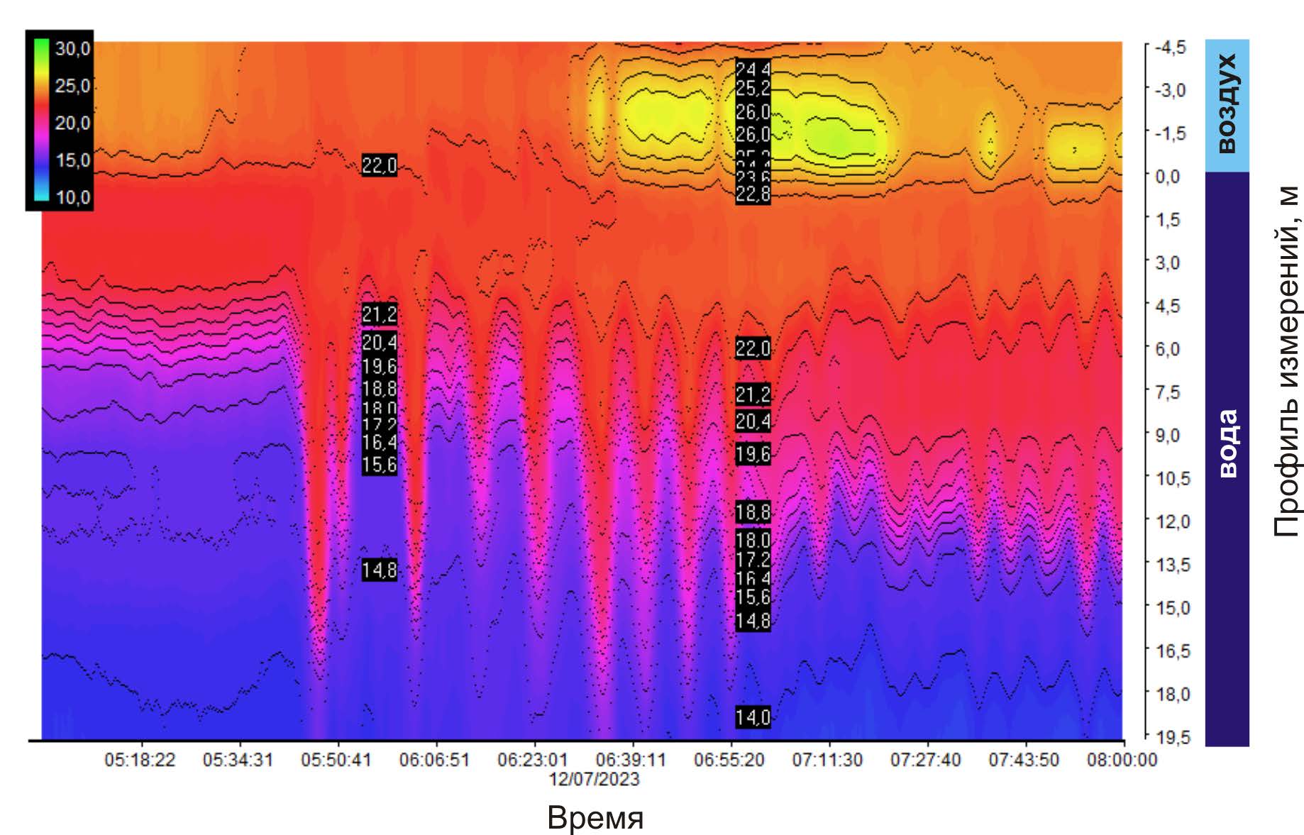 Следует отметить, что более ранние испытания термопрофилемеров с повышенным разрешением по профилю (с длиной участков по 20 см), проведенные на океанографической платформе, не продемонстрировали каких-либо значимых преимуществ при регистрации первичных параметров исследуемых внутренних волн. Инерционность измерителей в жидкости из-за защитной грузонесущей полиамидной оболочки-трубки составила около 30 с. Погрешность измерений осредненной на участке температуры метрологически определена как ±0.1 °С. Период опроса всех 16 датчиков – участков профиля одного измерителя – составлял 0.5 с. Измерительные данные поступали одновременно со всех трех измерителей на бортовой компьютер с привязкой к единому таймеру и в телеметрическом режиме отображались в виде градиентного поля и изотерм.