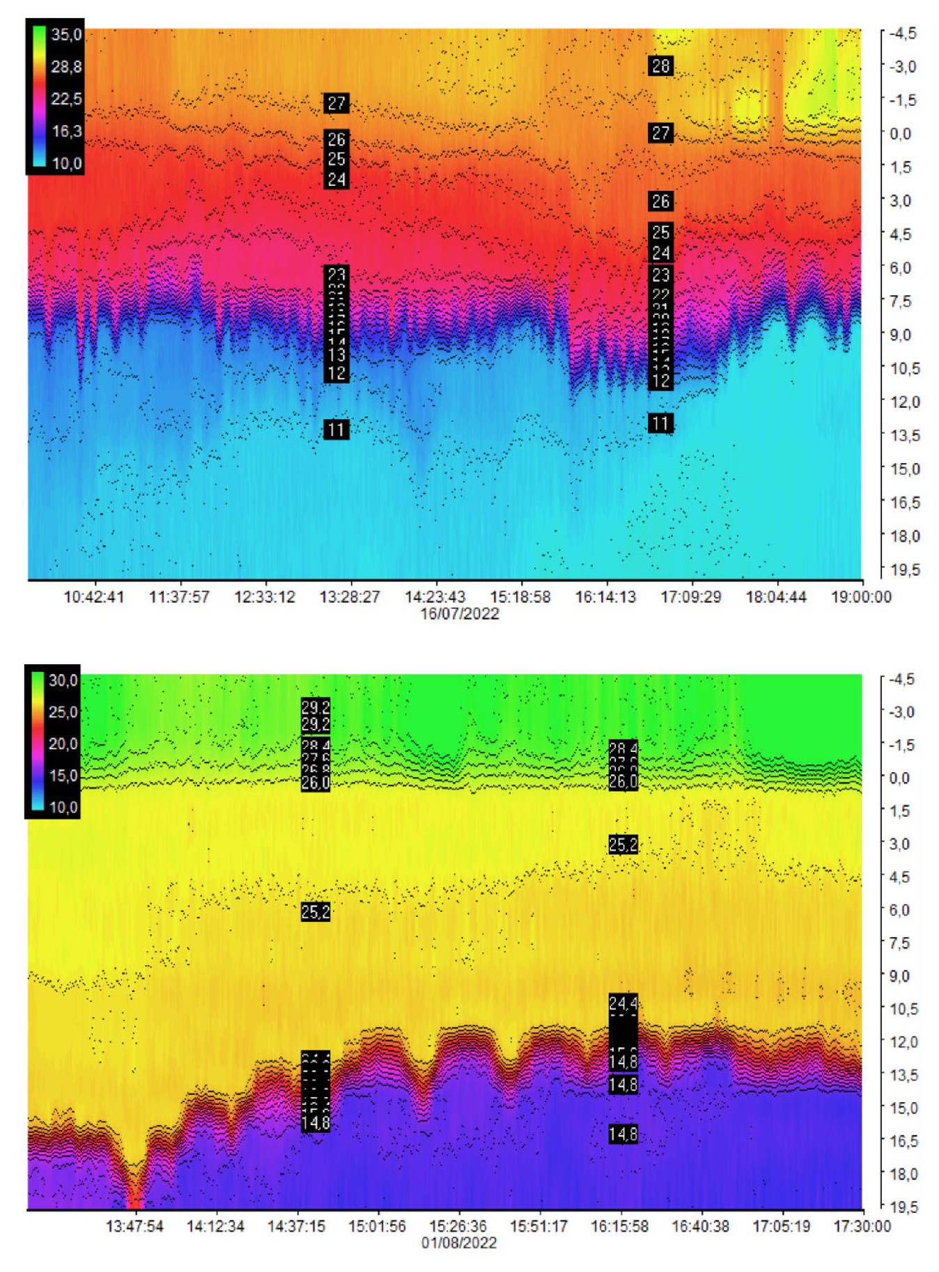 The created system of three thermoprofilemeters was tested for more than a year (from June 2021 to August 2022), which made it possible to analyze the data for two indicated seasonal periods. Almost all recorded significant changes in the depth of the pronounced thermocline were accompanied by wave processes reflected in vertical temperature profiles. Visualization (with a pronounced periodicity of at least five consecutive frequency components) and possibility of interpretation made it possible to determine about 10 manifestations of short-period internal waves lasting from 1 to 4 hours in one season. Such waves showed their average period of 10–12 minutes and amplitude of 2.5–3 m. Fig. 3 shows the examples of data display on the monitor screen during processing by the program in telemetric measurement mode.