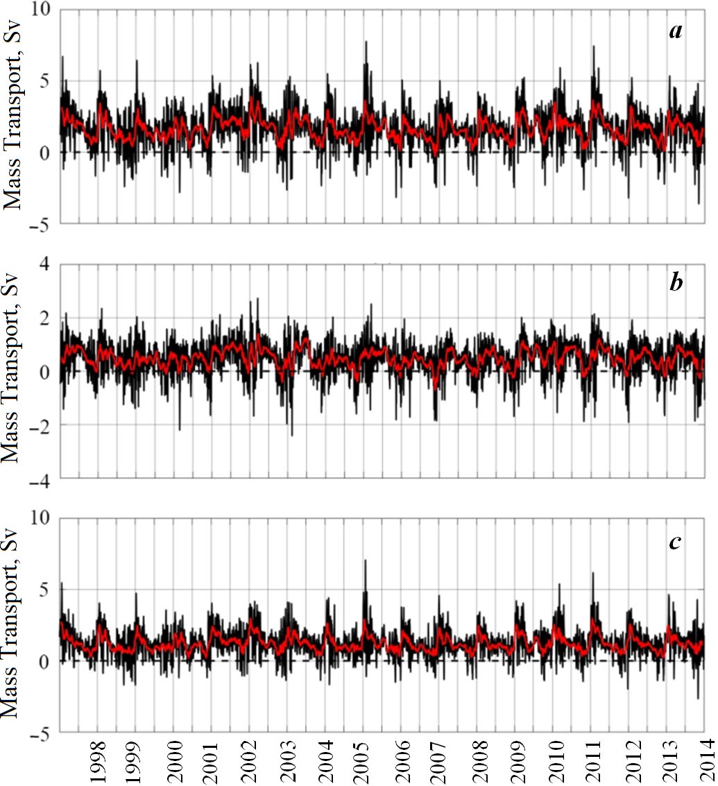 Fig. 3. Cross-shelf water mass transport (Sv) in the layers: 0–200 m (a), 0–50 m (b) and 50–200 m (c). Positive values stand for the transport directed off the shelf seawards. The red curve stands for the trend based on a running mean, with a 30-day smoothing window [12]