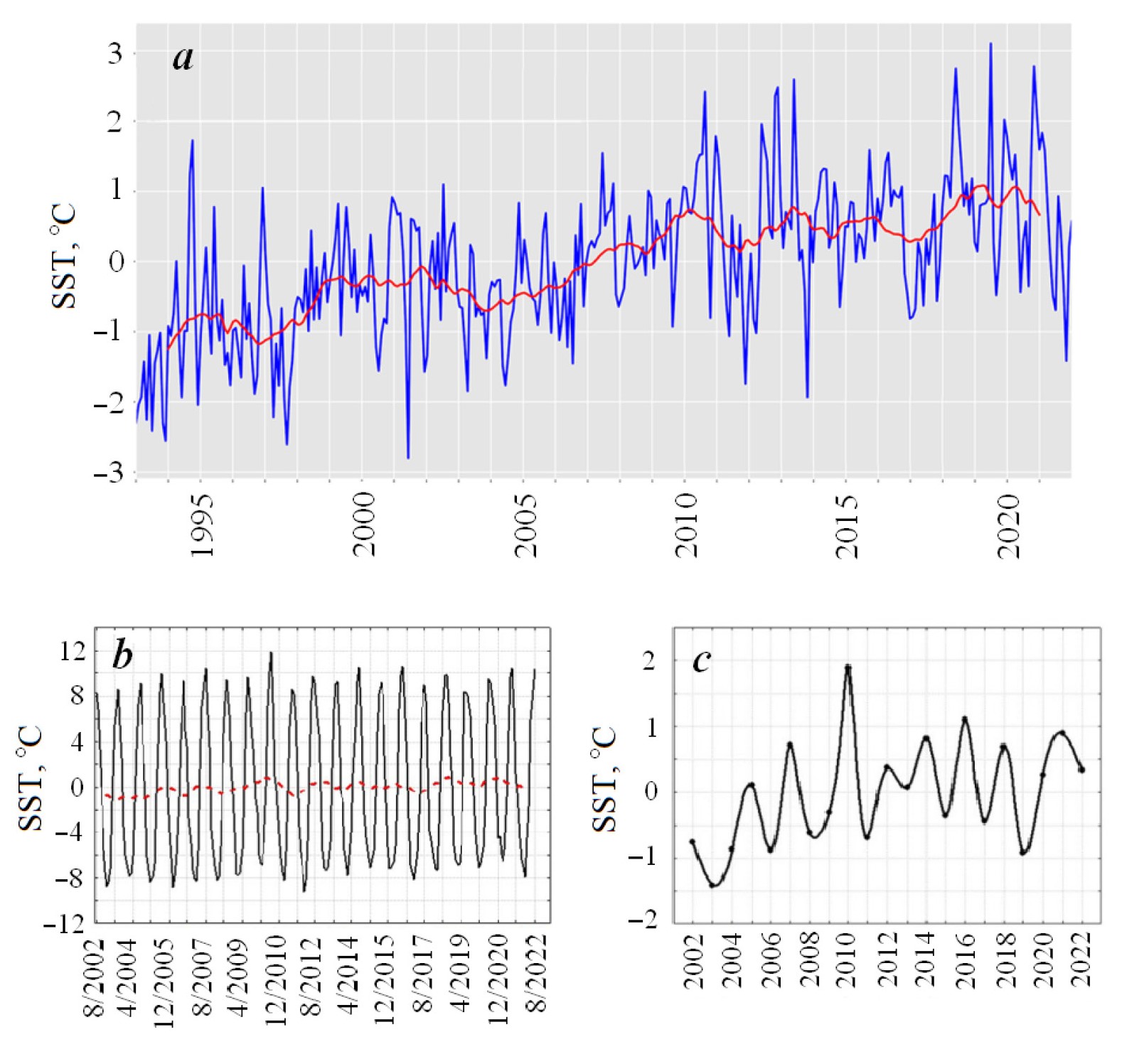 Fig. 4. Temporal variability of the sea surface temperature: sea surface temperature deviations from the mean, on a basin scale (https://data.marine.copernicus.eu/product/BLKSEA_OMI_TEMPSAL_sst_area_averaged_anomalies/description) (a); the Crimean shelf sea surface temperature anomalies in monthly time series. The red dashed curve stands for the running mean (with a 12-month window) (b); the Crimean shelf sea surface temperature anomalies of the summer season (in 2002–2022), smoothed by a cubic spline (c)