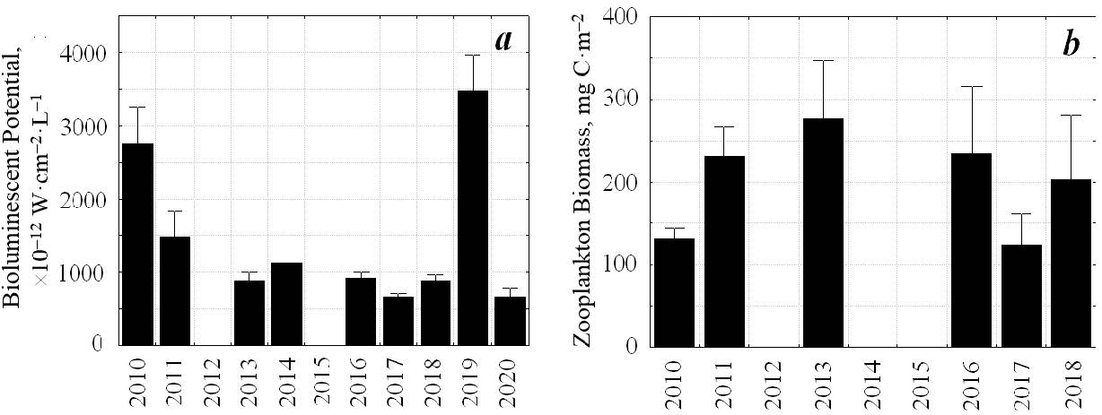 Fig. 7. Interannual variability of the bioluminescent potential, 10–12 W·cm–2·L–1 (a) and the forage zooplankton biomass, mg C·m–2, (b) on the Crimean shelf. The vertical whickers stand for the error mean