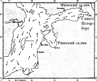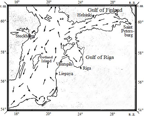 The current regime in the Gulf of Finland is determined by the water exchange of the Gulf of Finland and the Gulf of Riga with the main part of the Baltic Sea. The currents are significantly influenced by the runoff of water from the land. There is a more or less stable constant current directed to the west and explained by the runoff of the Neva River (Fig. 2). In addition, temporary wind currents arise under the influence of winds 10).