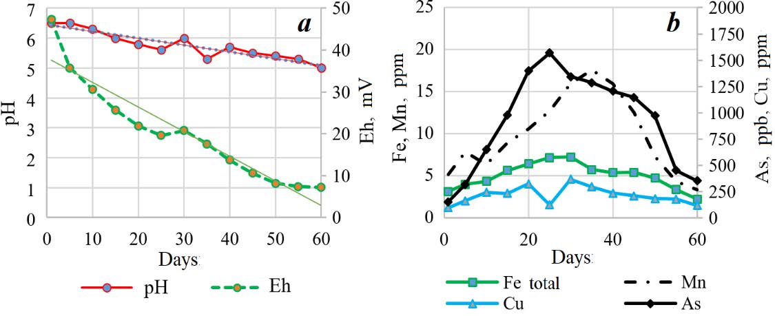 Laboratory modelling of weathering of arsenopyrite waste ore in seepage conditions shows that the pH value gradually decreases with time; while the content of released elements gradually increases. At lower pH values (4.5÷2.5), the concentration of elements in the aqueous phase noticeably increases. This is explained by the effects of adsorption, desorption, dissolution of Fe(III) hydroxide formed due to weathering of ore, and formation of acid in the process of weathering.