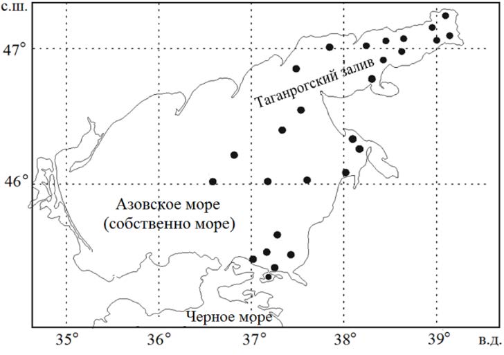 Пробы воды для анализа отбирались пробоотборной системой ПЭ-1220 согласно ГОСТ 31861-2012 и РД 52.24.309-2016 с поверхностного горизонта в 32 точках (рис. 1). Исследования проводились в центральной и восточной частях Азовского моря и в Таганрогском заливе. Пробы воды отбирались весной (март – апрель), летом (июнь – июль), осенью (сентябрь – октябрь) и зимой (декабрь). Забортные работы выполнялись по стандартным методикам. Химический анализ проб воды на содержание кадмия производился в соответствии с методикой ПНД Ф 14.1:2:4.140-98, нижний предел чувствительности – 0.00001 мг/дм3.