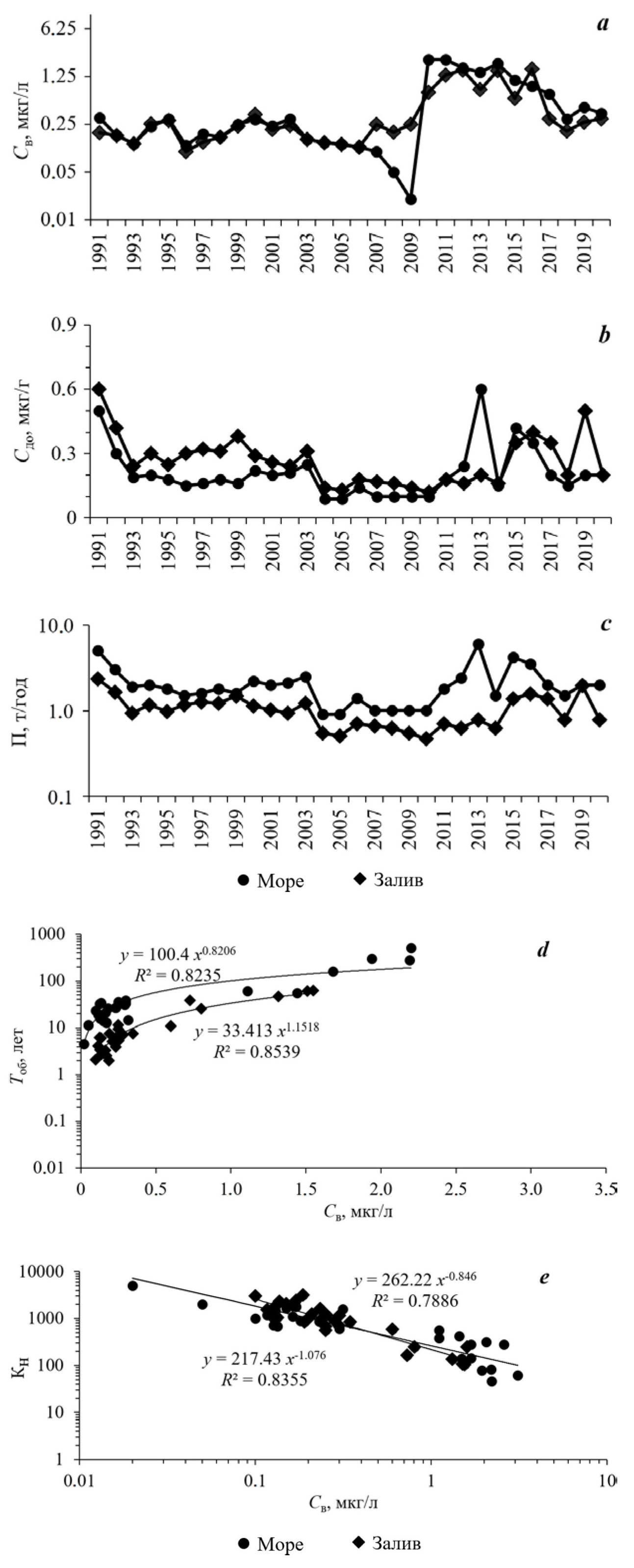 Исследование тренда изменения коэффициента накопления кадмия донными отложениями (Кн = Сдо/Св) в зависимости от его концентрации в воде показало, что эта зависимость с высокой степенью статистической достоверности (коэффициент детерминации R2 равен 0.83 в Таганрогском заливе и 0.78 – в собственно море) ложится на прямую линию на графике с логарифмическими масштабами по осям ординат (рис. 2, e).