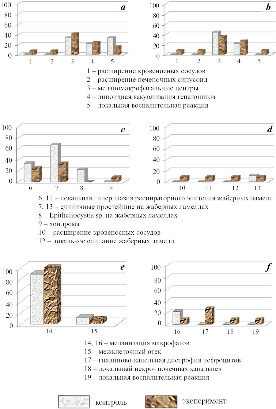 Морской ерш. В печени встречаемость липоидной вакуолизации гепатоцитов и меланомакрофагальных центров различалась незначительно (рис. 2, b), тогда как расширение печеночных синусоид (9.1 %) и кровеносных сосудов (18.2 %), а также локальную воспалительную реакцию (9.1 %) отмечали только у рыб опытной группы (рис. 1, e; 2, b). В жабрах локальную гиперплазию эпителия и слипание жаберных ламелл, а также расширение кровеносных сосудов выявили только у рыб опытной группы (по 9.1 %) (рис. 1, f; 2, d). В почках наиболее часто наблюдали меланизацию макрофагов (22.2 и 9.1 % в контрольной и опытной группах соответственно). Локальную воспалительную реакцию, гиалиново-капельную дегенерацию и некроз клеток почечных канальцев регистрировали только у рыб опытной группы (9.1, 27.3 и 9.1 %) (рис. 2, f).