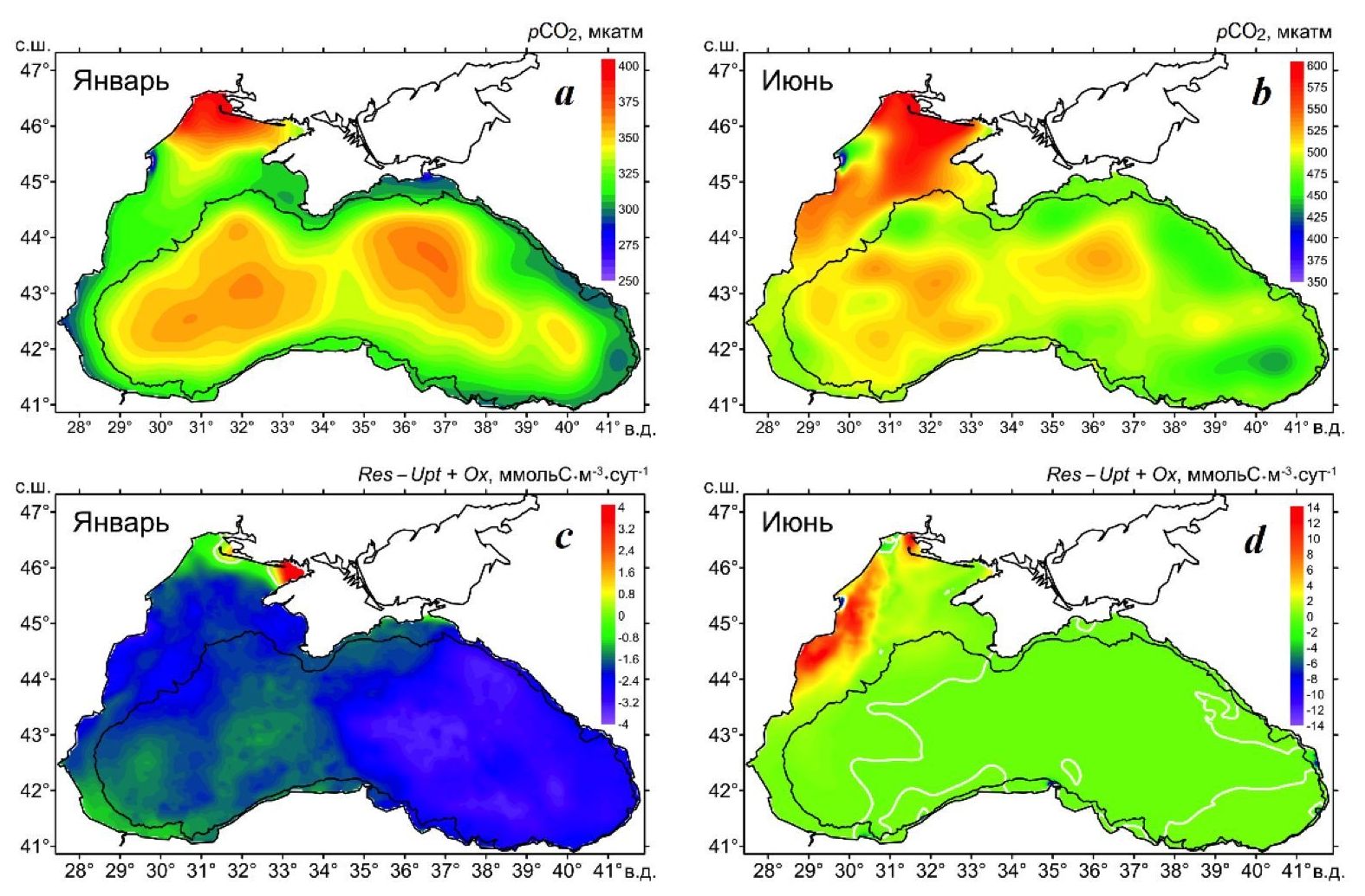В январе почти на всей акватории эта величина имеет отрицательные значения (за исключением небольшой области в Каркинитском и Тендровском заливах). На карте распределения pCO2 (рис. 4, a) в этом месте выделяется локальный максимум. То есть за счет биологических процессов в январе преобладает поглощение углекислого газа над его выделением. В июне большая часть области имеет положительные значения, за исключением центральной части моря, где она близка к нулю.