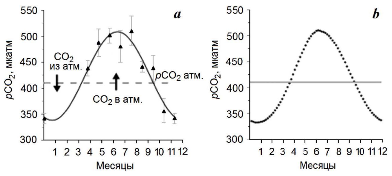 Рис. 7. Внутригодовая изменчивость pCO2 по данным наблюдений (a) и результатам численного моделирования (b)
