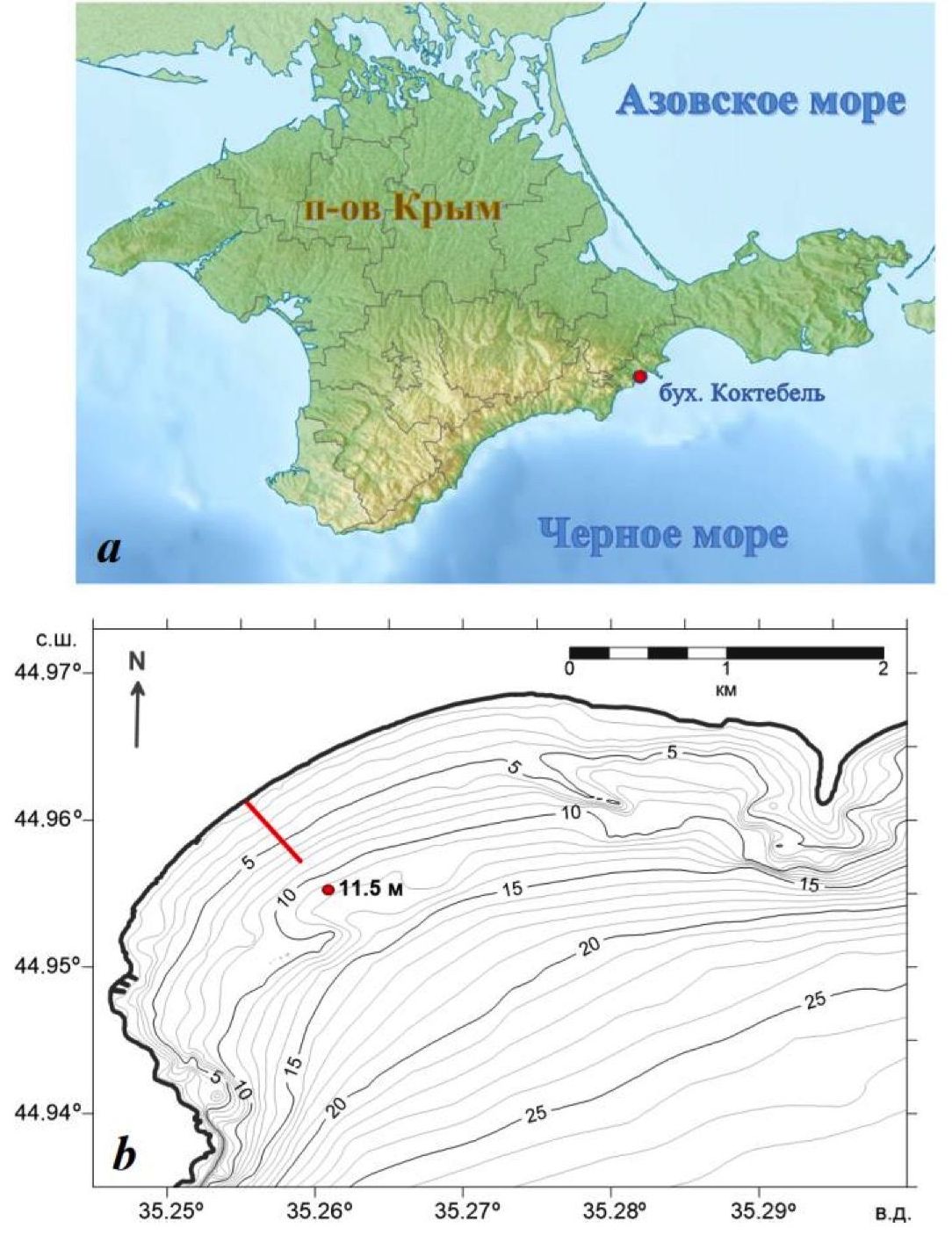 Рис. 1. Положение изучаемой области (a); батиметрическая карта-схема бух. Коктебель (b) (точка 11.5 м – точка статистического анализа SWAN-ERA; красная линия – профиль береговой зоны для моделирования)