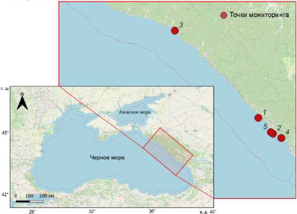 Fig. 1. Monitoring area. The numbers indicate beaches: 1 – Loo; 2 – Sochi; 3 – Vostok; 4 – Maly Akhun; 5 – Primorsky