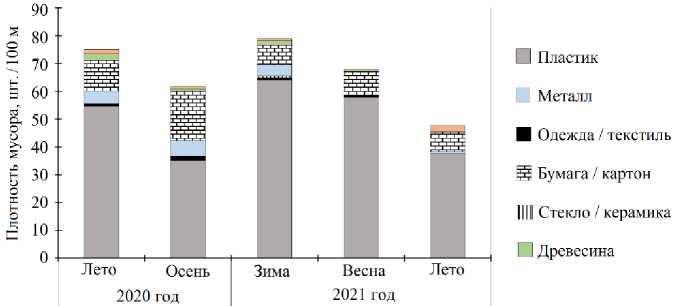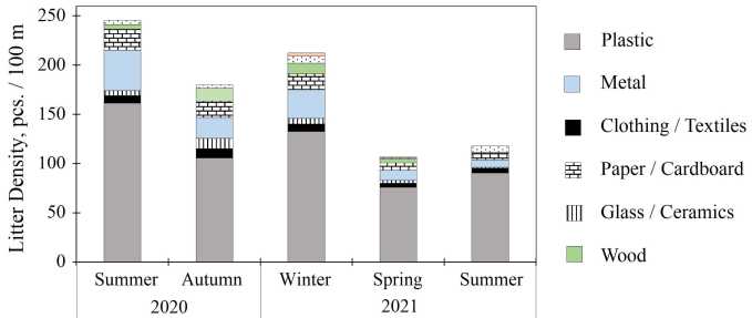 The highest litter concentrations were observed in the summer period of 2020 (245.2 pieces / 100 m) and in the winter period of 2021 (212.5 pieces / 100 m) (Fig. 2).