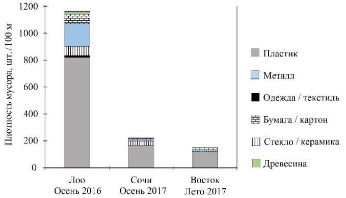 Fig. 4. The density of marine litter on the beaches of Loo, Sochi, Vostok