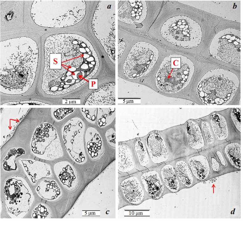Fig. 1. Changes in Ulva lactuca cells in the experiment: a – control for 0 days; b – 5 days of the experiment at 10 mg/L (200 MPC) diesel fuel (DF); c – 5 days of the experiment at 20 mg/L (400 MPC) DF; d – 10 days of the experiment at 20 mg/L (400 MPC) DF. Notations: P – pyrenoid, S – starch granules, C – core. Arrows indicate bacteria on the thallus periphery