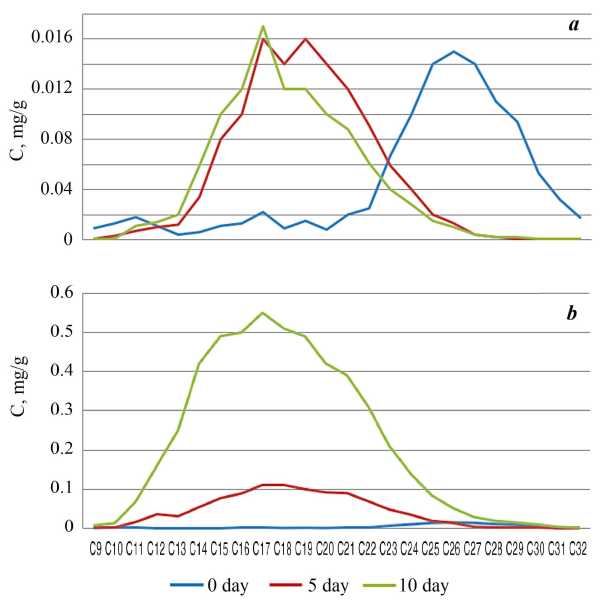 Fig. 2. Mass fraction of n-alkanes in the tissues of the Ulva lactuca during the experiment with the addition of DF: а – 10 mg/L (200 MPC); b – 20 mg/L (400 MPC)
