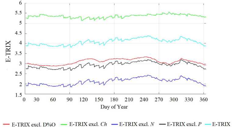 Если в исходной формуле заменить гидрохимический параметр на 1 (т. е. исключить его из формулы), то индекс трофности может либо увеличиться (если исключить концентрацию хлорофилла а), либо уменьшиться (если исключить концентрацию общего фосфора, минерального азота, отклонение в абсолютных значениях содержания растворенного кислорода от 100%-ного насыщения) (рис. 3). Из представленного рисунка видно, что значение E-TRIX больше всего уменьшается (почти в два раза) при исключении минерального азота, что очередной раз показывает, что его вклад в расчетную формулу в данном регионе максимальный.