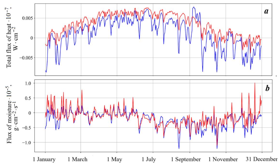 Fig. 3. Total fluxes of heat (a) and moisture (b) in 2016 according to ERA5 (red lines) and SKIRON (blue lines)