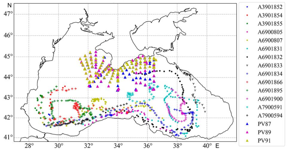 Fig. 4. Map of location the temperature and salinity measurement stations conducted by ARGO floats and R/V Professor Vodyanitsky in 2016