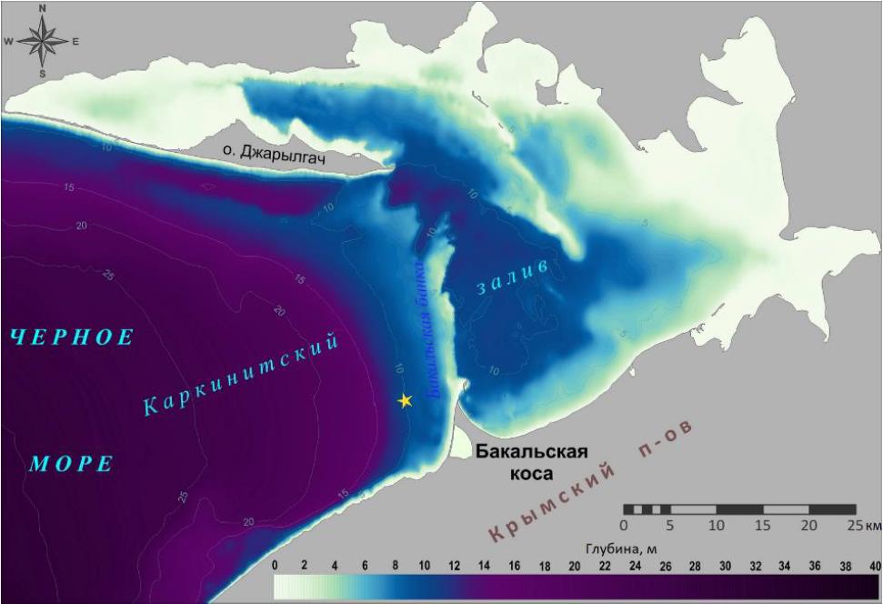 Fig. 1. Schematic map of the Karkinitsky Gulf in the Black Sea (data on underwater topography are given using SonarChart™ materials) (Available at: https://webapp.navionics.com). The star denotes the point for which the main wave parameters were calculated