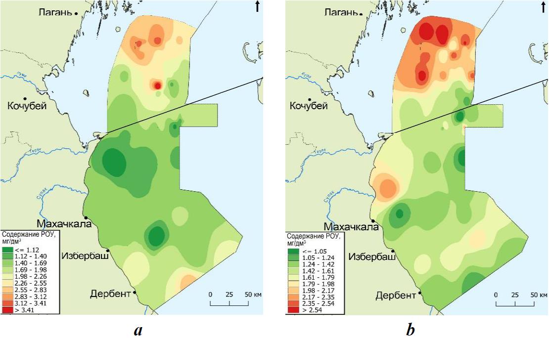 According to literature, in the Russian sector of the Caspian Sea, the maximum DOM and SOM content is registered in the north-western part of the Northern Caspian, in the estuaries of the Terek and Sulak Rivers, as well as in the hydrologic front zone. The OM concentration decreases seaward 5 [2, 5].