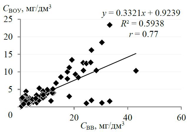 The SOC concentration varied in the range of 0.10–23.40 mg/dm3 in the surface water layer and in the range of 0.05–19.40 mg/dm3 in the bottom water layer (Table 2). The SOC vertical distribution and seasonal dynamics repeated changes inthe SM concentration (Table 1). The maximum SOC values recorded in the spring period are explained by the input of allochthonous organic matter with the Volga River runoff during the high flood period. However, from spring to autumn, the correlation between SOC content in the surface and bottom water layers became weaker. Thus, correlation coefficient was 0.66 (n=134; α=0.05) in spring; 0.61 (n=72; α=0.05) in summer; 0.48 (n=142; α=0.05) in autumn. The decrease in the correlation ratio between these parameters is due to the fact that inspring SOC was a part of allochthonous (hard-to-mineralise) OM supplied with the Volga waters during high floods, and almost did not decompose in the water column, while in autumn it was a part of autochthonous (easily acidifiable) OM mineralised in the whole water column.