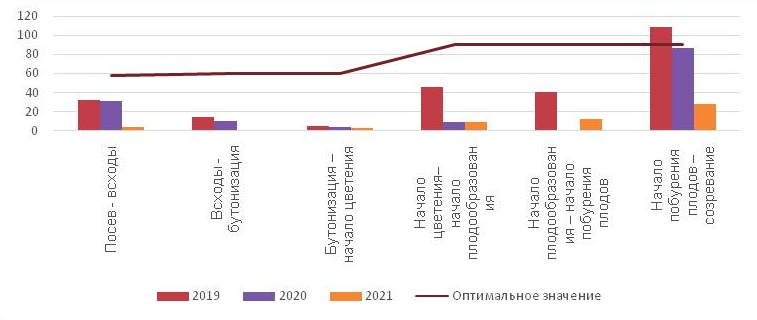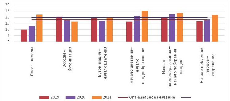 В межфазный период «всходы – бутонизация» происходит закладка всех метамеров растений. В 2019 и 2020 гг. среднесуточная температура в данный период находилась в оптимальных границах и составила 20,5 и 18,3 °С соответственно. В 2021 году в данный межфазный период отмечалось понижение среднесуточной температуры до 16,6 °С, что повлияло на снижение потенциальной урожайности изучаемого сорта.