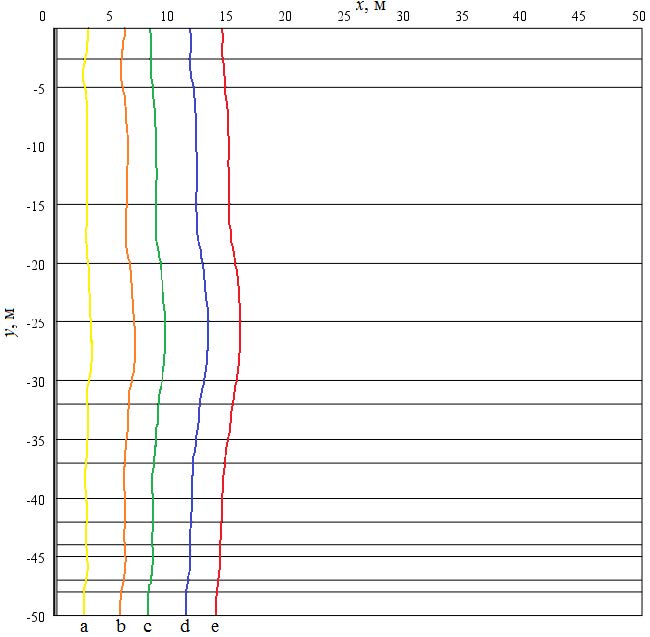 Fig. 4. Isothermal lines 273.15 K in the considered region of the solution at T1=323.15 K: a) 1 year; b) 5 years; с) 10 years; d) 20 years; e) 30 years
