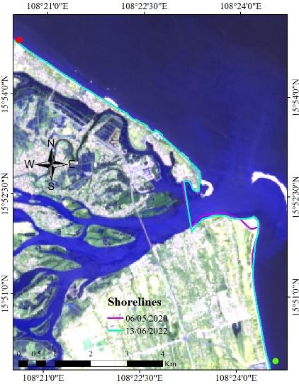 Besides, there have been a lot of studies on shoreline changes done in Vietnam in recent years. Specifically, Nhan et al. calculated the changing speed and trend of the Red River bank from Son Tay to Gia Lam area (Hanoi) using remote sensing images for the period 2007–2016 combined with GIS [7]. Tuan et al. used water indices such as NDWI, MNDWI, AWEI from Landsat 8 remote sensing images to determine water and land boundaries on the West coast of Vietnam [8]. Mau et al. used remote sensing images combined with shoreline survey by DGPS–Promark2, the results show that the erosion rate is higher than the deposition rate in Cua Dai area, mainly due to construction works and impacts of wave [9]. Cham et al. used remote sensing in combination with Delft3D and Mike 11 models to determine the cause and mode of erosion and deposition in Cua Dai area, showing that the process of erosion-deposition occurs in the Northeast winter with the cause of impacts wave motion of the northeast monsoon with wave height of approximately five meters with a frequency of more than 70% [10]. Quang et al. used the Digital Coastal Analysis System (DSAS) technique to statistically calculate the rate of change of the Quang Nam coastline from 1990 to 2019, showing that the Quang Nam coast was eroded and deposited over the past three decades and erosion is most severe in the north of Cua Dai, while shoreline evolution is recorded in the southern region [11]. In the authors used Telemac model combined with hydrodynamic and wave module to study Cua Dai area, showing the main trend of currents and waves towards the south, leading to erosion especially in the northeast monsoon season and deposited in the estuary [12].