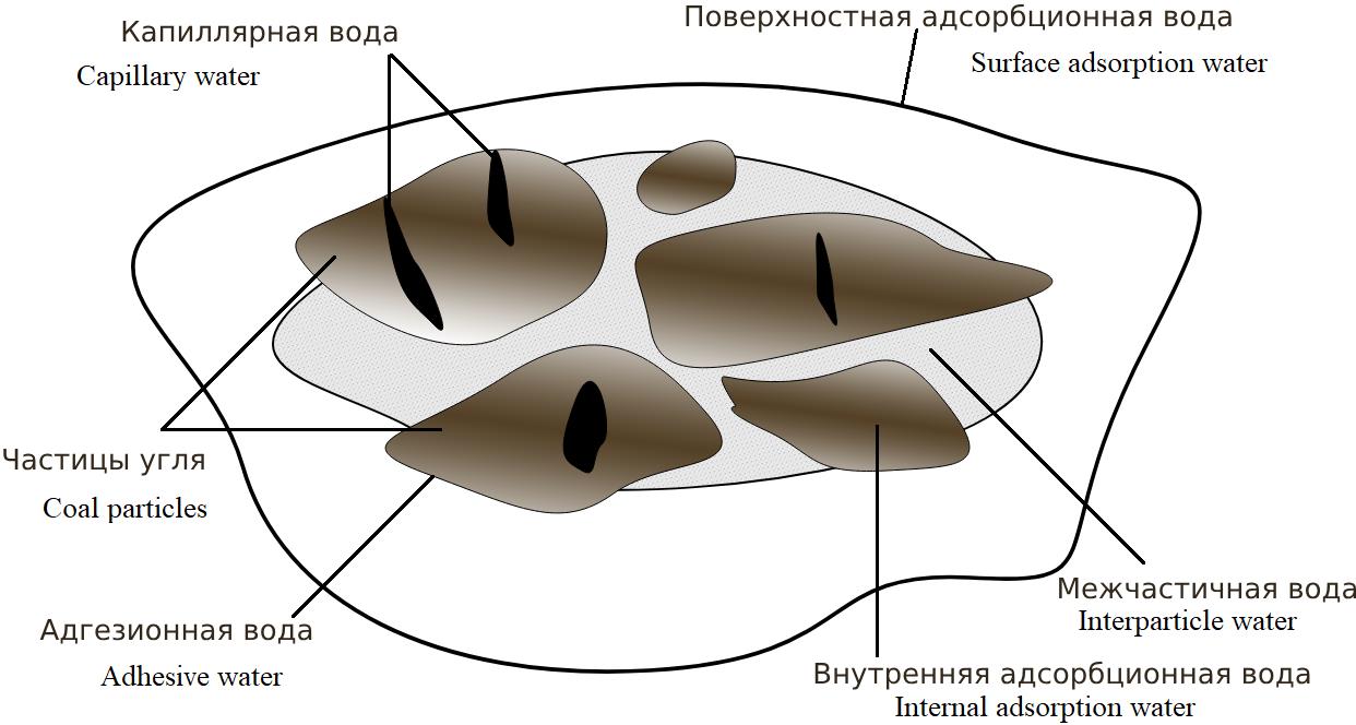 Для начала рассмотрим различные типы воды, связанной с углем. Можно выделить пять типов: внутренняя адсорбционная вода, поверхностная адсорбционная вода, межчастичная вода, капиллярная вода и адгезионная вода (рис. 1). Капиллярная вода содержится в капиллярах и мелких щелях, находящихся между различными частицами. Межчастичная вода находится между различными частицами, а адгезионная вода образует слой пленки вокруг поверхности конкретных частиц. Внутренняя адсорбционная вода содержится в микропорах и микрокапиллярах внутри каждой угольной частицы и откладывается в процессе формирования. Поверхностно-адсорбционная вода примыкает к молекулам угля, но только на поверхности частиц.