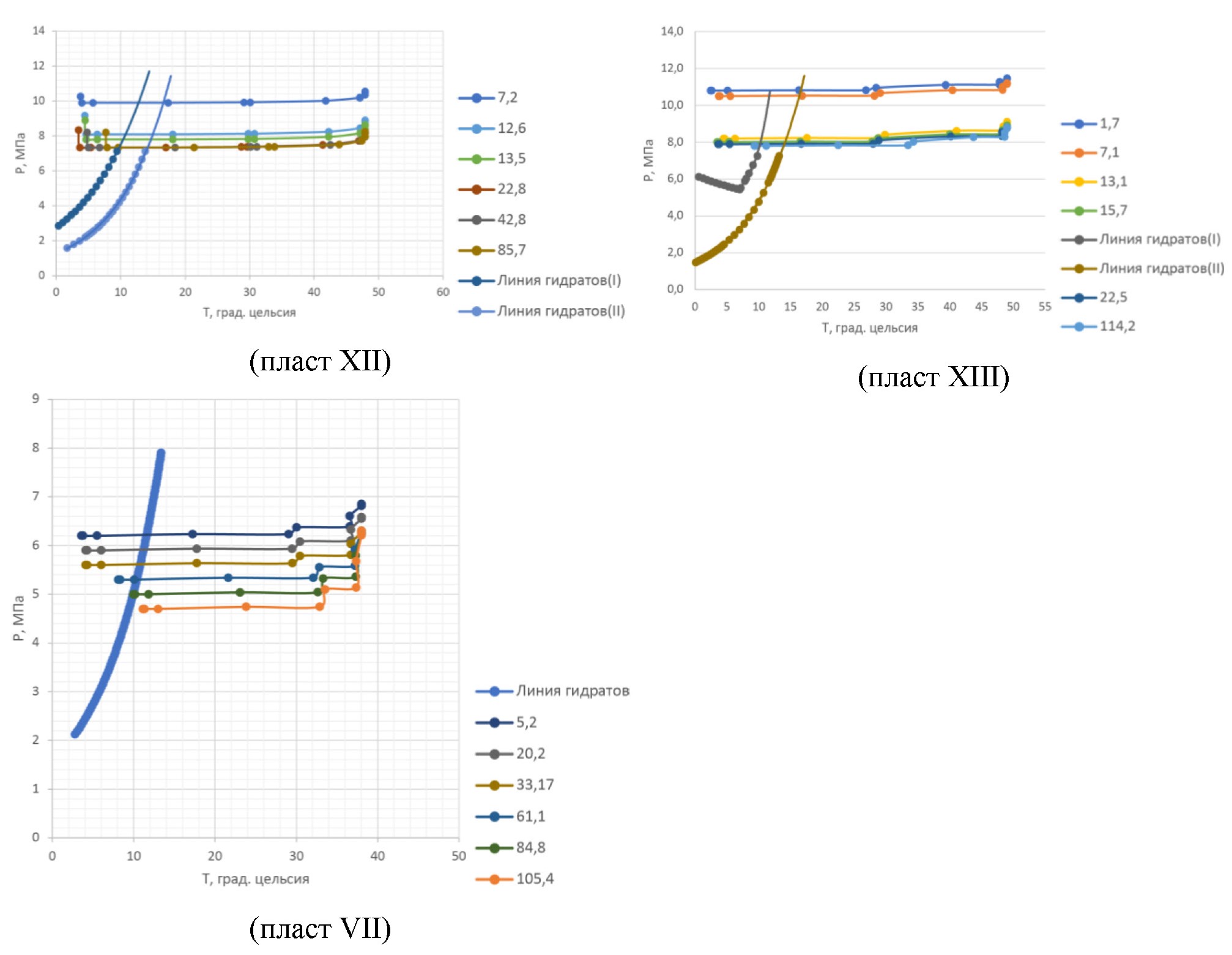 Рис. 9. Равновесные кривые гидратообразования для пластов XII, VII и XIII