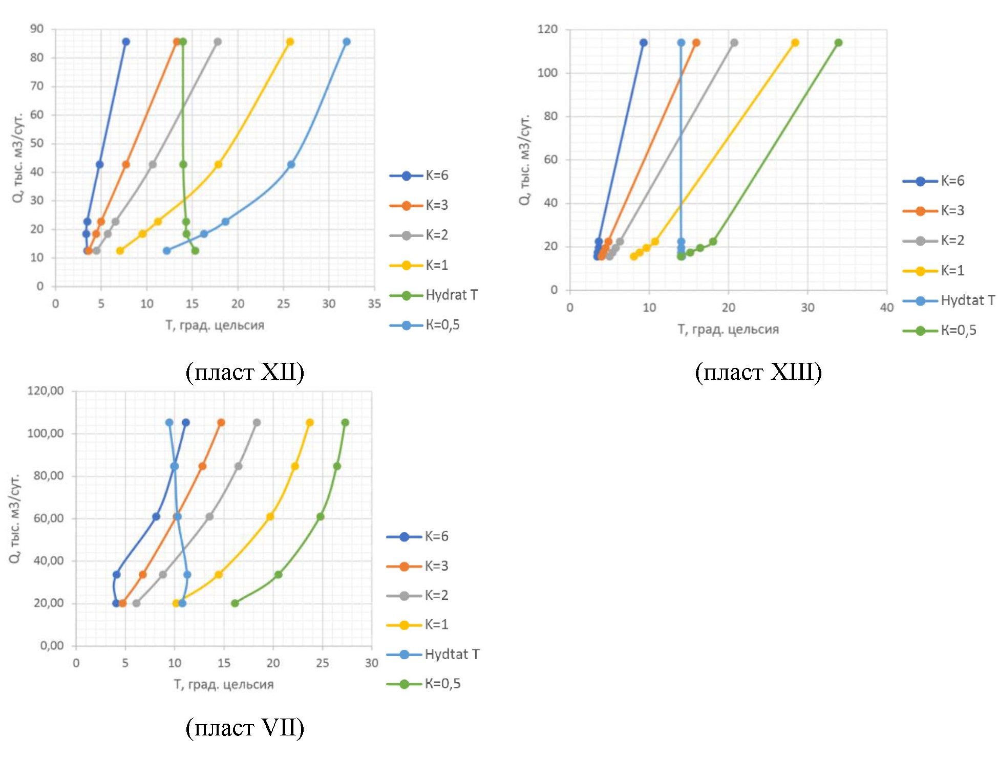 Изменение технологического режима не приводит к выводу скважин XII и XIII пластов из зоны образования гидратов. Однако для пласта VII установление значения дебита скважины выше 84,8 тыс. м3/сут. приведёт к установлению безгидратного режима.