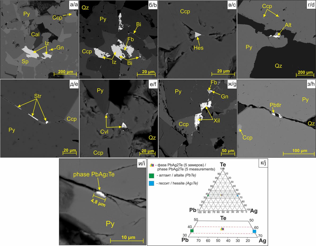 В процессе изучения сплошных руд было обнаружено единичное включение неидентифицированного минерала с обобщенной формулой PbAg2Te. Концентрации главных минералообразующих элементов составили по результатам пяти замеров, мас. %: Ag – 33,54; Te – 26,02; Pb – 40,41. Включение минеральной фазы с видообразующей ролью Pb располагается в трещине пирита и образует вытянутое полуовальное зерно длиной 4,8 мкм (рис. 4, и). Система PbAgTe выделена на основании предполагаемого парагенезиса фаз Pb–Te и Ag–Te, являющихся, по-видимому, срастаниями алтаита PbTe и гессита AgTe2 (рис. 4, к). Данная минеральная фаза была обозначена нами как неидентифицированный минерал с обобщенной формулой PbAg2Te (табл. 2).