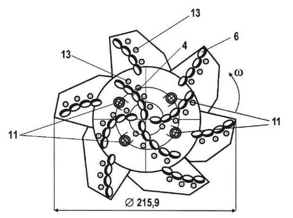 Рис. 2. Двухъярусное антивибрационное долото (вид снизу): 4 – резцы нижнего разбуривающего яруса; 6 – резцы верхнего разбуривающего яруса; 11 – сменные гидромониторные насадки; 13 – конусные PDC верхнего и нижнего ярусов