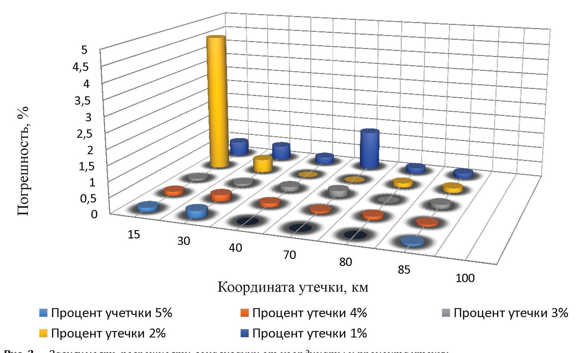 Представим в виде диаграммы зависимость погрешности в определении координаты от процента утечки, а также от координаты, в которой она произошла. Как следует из анализа диаграммы на рис. 3, погрешность в данном методе довольно хаотична и ее максимумы, если рассматривать зависимость от координаты, возникают при различных координатах, хотя можно заметить, что на 80 и 85 км максимальной погрешности не наблюдается ни в одном из рассматриваемых случаев. Также, если рассматривать каждую координату при различных процентах утечек, прослеживается максимум погрешности при утечке 1 %, кроме случая с УНВ на 15 км, где максимум находится на утечке 2 %. В случае учета сдвига напора (рис. 4) из-за перепада мощностей насосных агрегатов погрешность более «структурированная». Ее рост происходит с уменьшением процента утечки. Анализ зависимости от координат показывает, что точность возрастает к концу участка, независимо от степени утечки. Максимальные погрешности наблюдаются на 15 и 30 км.