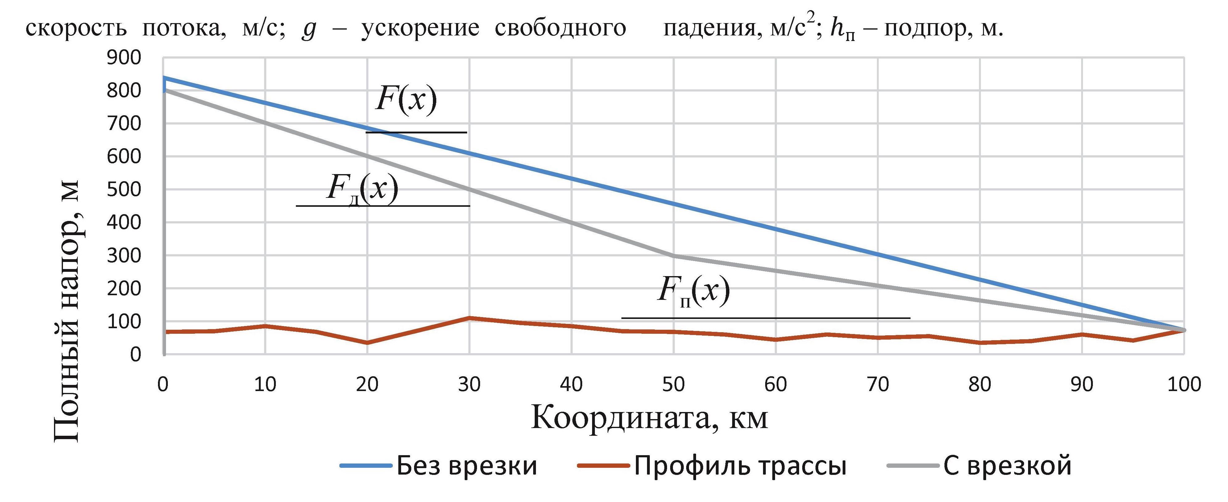 Исходя из предположений о том, что утечка произошла в координате x=30 км, примем существование некоторого участка нефтепровода длиной L=100 км, диаметром d=Ø720×8 мм, также принимая во внимание, что z=68 м, hп=60 м. Известно, что расход на участке до врезки составил 3027,1 м3/ч, после – 2125,5 м3/ч. Примем =0,05.
