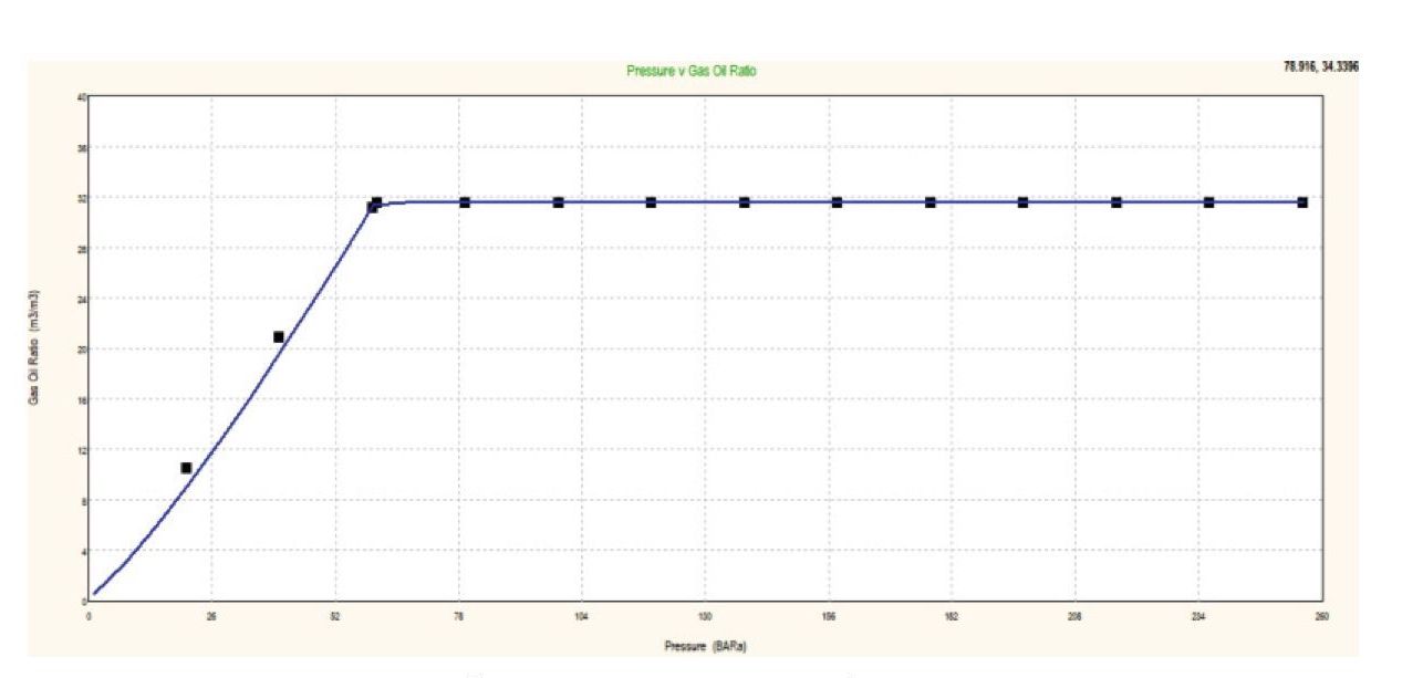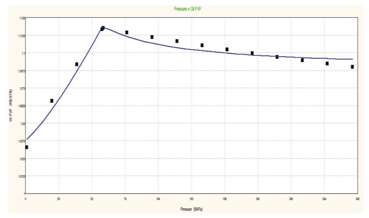Чёрными точками отображены значения, полученные на адаптированной модели уравнения состояния. Эти данные используются для выбора наиболее подходящей корреляции модели чёрной нефти (эта корреляция на графике отображена синим цветом).
