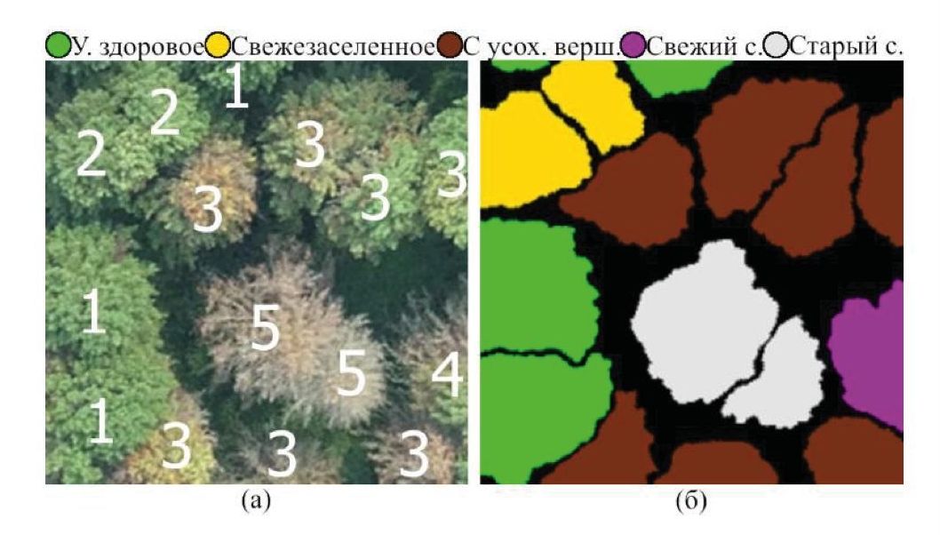 Рис. 4. Фрагмент панорамы деревьев P. sibirica, размеченных по классам (а) и соответствующей ему маске сегментации (б)