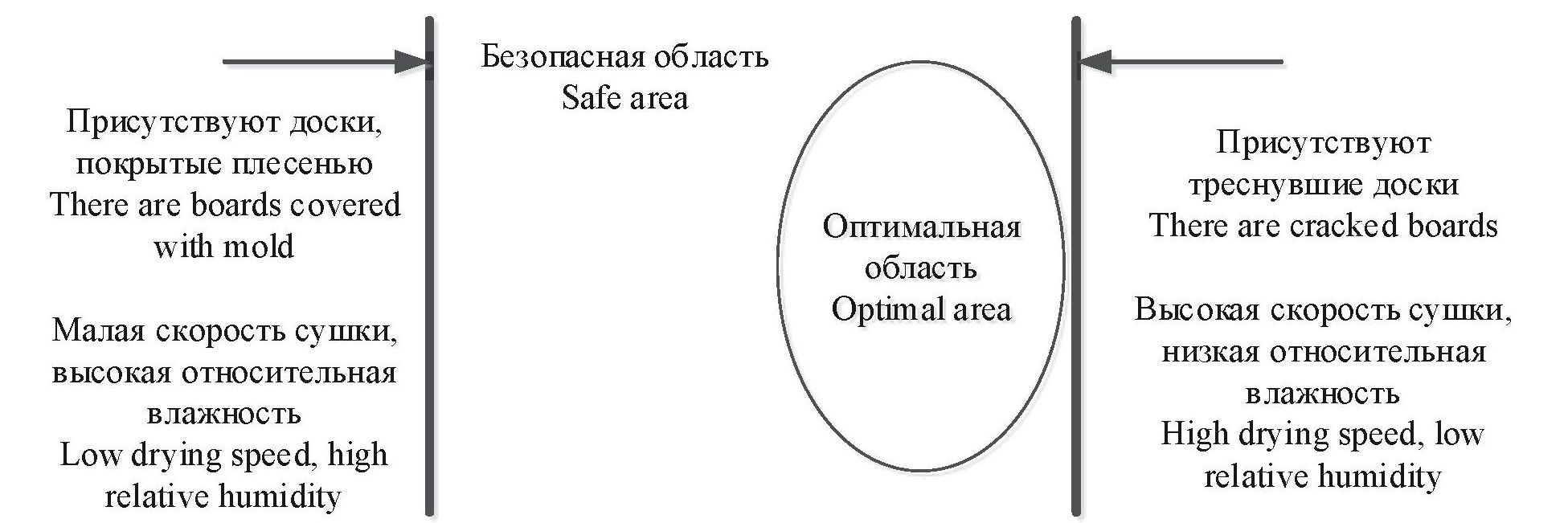 На основании табл. 2 и технологических карт процесса камерной сушки древесины [1–8] можно сделать предположение, что существует определенная «Безопасная область» (рис. 1), в которой при любых сочетаниях величин температуры и психрометрической разности на пиломатериале не возникают дефекты, но при этом скорость сушки может не быть оптимальной. Также внутри данной области может быть определена «Оптимальная область» (рис. 1), в которой не возникают дефекты и скорость сушки максимальна.