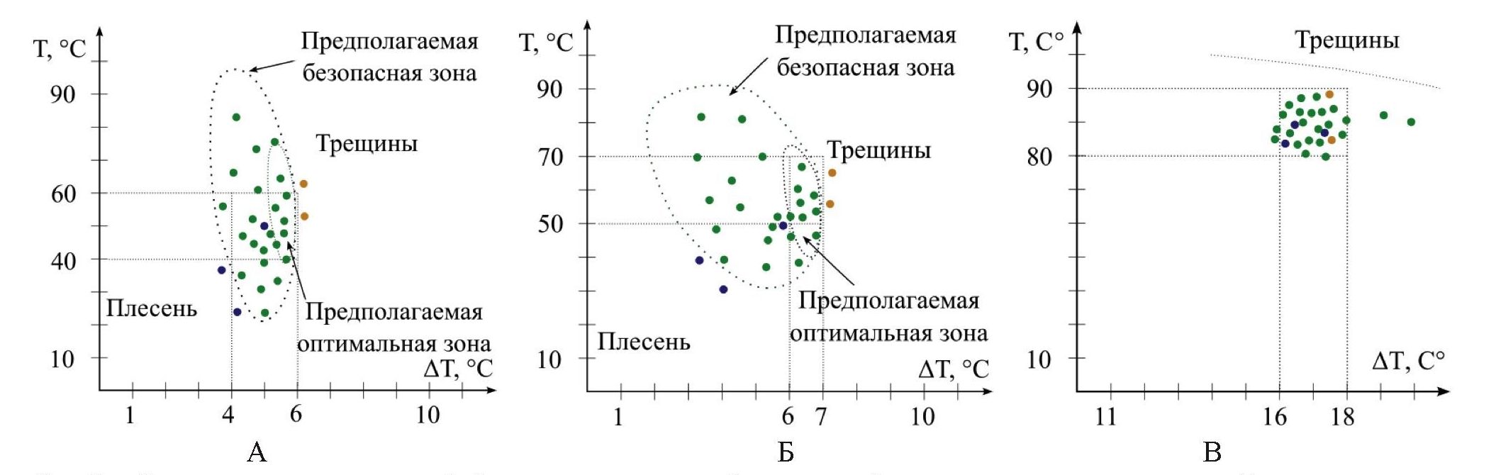 Рассматриваемый в статье алгоритм по пересчету Т и ΔТ, согласно криволинейным функциям, был применен к базе уже имеющихся знаний о результатах предыдущих сушек (рис. 3, А, Б), в результате чего были получены величины Т` и ΔТ` (рис. 6) следующих режимов сушки.